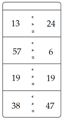 | 11 < 12 | 58 > 47 | 29 = 29 | 43 < 50 |