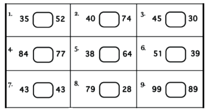 | 11 …. 58 | 36 …. 27 | 11 + 2 …. 18 – 5 |
