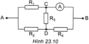 Cho mạch điện như Hình 23.10. Cho biết ({R_1} = 15Omega ),({R_2} = {R_3} = {R_4} = 10Omega ). Điện trở của ampe kế và các dây nối không đáng kể.