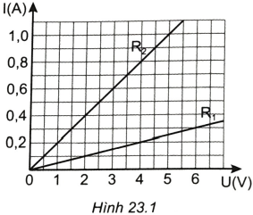 Từ đồ thị biểu diễn sự phụ thuộc của cường độ dòng điện vào hiệu điện thế đối với hai điện trở ({R_1};{R_2}) trong Hình 23.1 .Điện trở ({R_1};{R_2}) có giá trị là