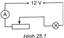 Một đoạn mạch gồm một bóng đèn có ghi 9 V- 4,5 W được mắc nối tiếp với một biến trở và được đặt vào hiệu điện thể không đổi 12V như Hình 25.1. Điện trở của dây nối và ampe kế rất nhỏ