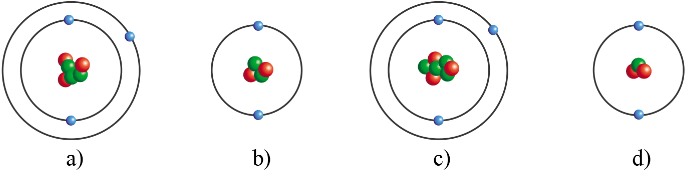 Nguyên tử ở hình b) và d) thuộc cùng một nguyên tố hóa học vì cùng có 2 proton (hạt màu đỏ).
