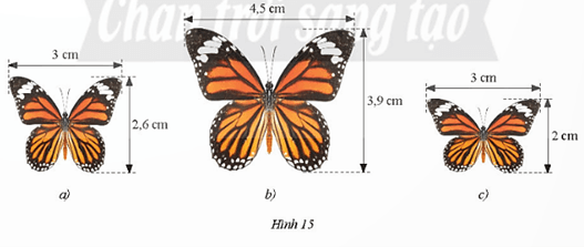 $\frac{{4,5}}{3} = 1,5;\frac{{3,9}}{2} = 1,95$. Do đó, không tồn tại hình động dạng phối cảnh nào của hình 16b để bằng hình 16c. Do đó, hình 16b và hình 16c không đồng dạng với nhau.