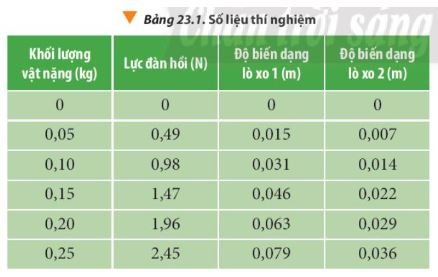 a) Dựa vào số liệu đo được từ thí nghiệm hoặc Bằng 23.1, vẽ đồ thị biểu diễn mối liên hệ giữa độ biến dạng của lò xo và lực tác dụng lên lò xo.