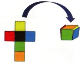 Bước 2: Gập 3 hình vuông màu vàng, màu đỏ, màu xanh dương, màu xanh lá theo cạnh kề với cạnh hình vuông màu đen rồi gập hình vuông màu cam sao cho có 1 cạnh kề với cạnh của hình vuông còn lại ta được hình lập phương.