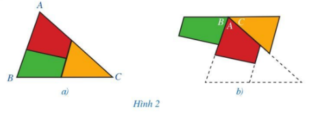 Cắt tam giác ABC thành ba mảnh (Hình 2a) và ghép lại (Hình 2b). Quan sát Hình 2b và dự đoán tổng ba góc A, B, C.