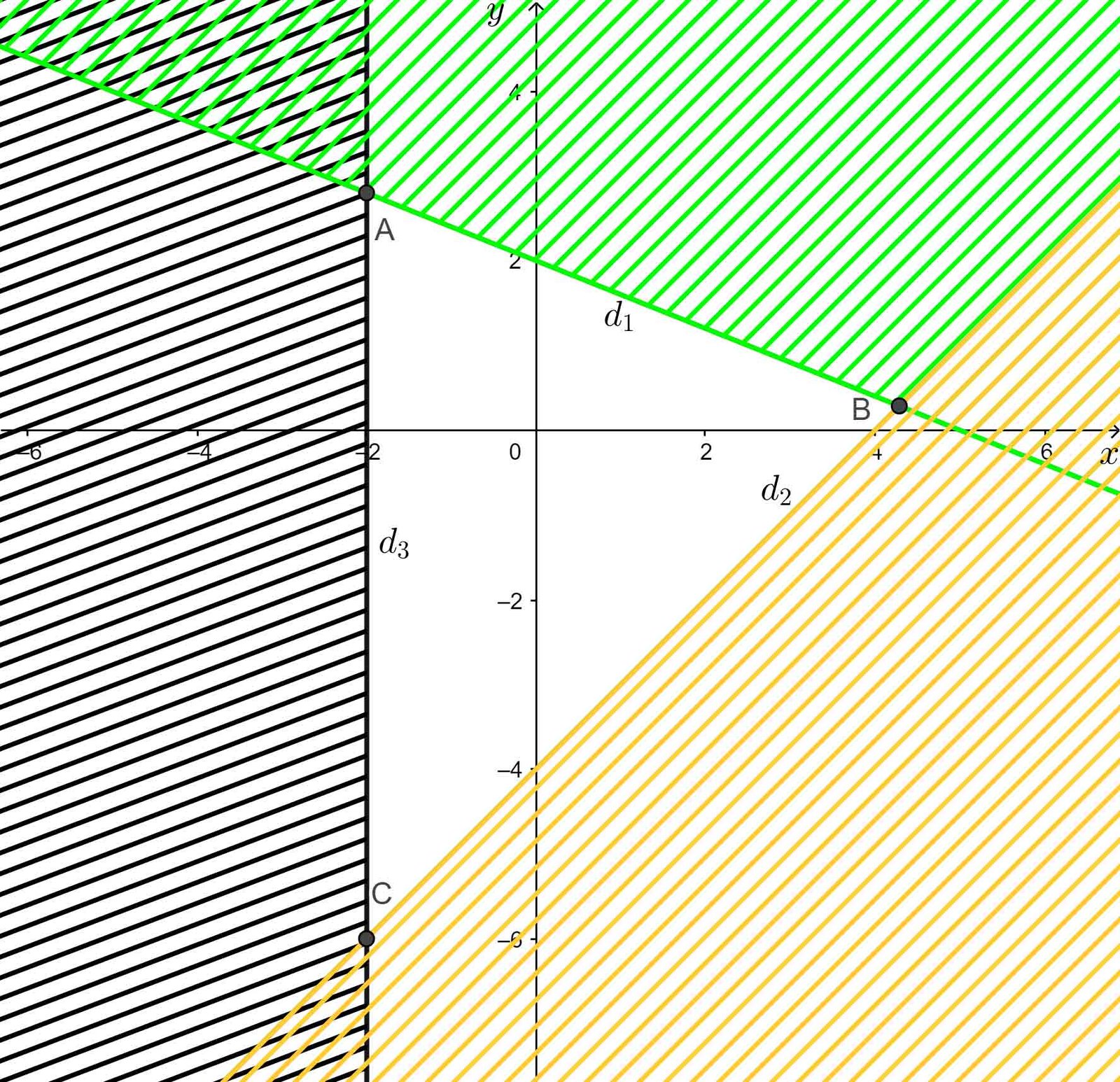 Miền nghiệm của hệ bất phương trình là phần không gạch sọc ở hình trên không kể đường thẳng d1 và d2.