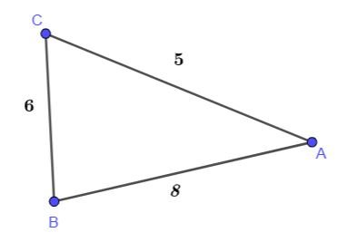 $\cos A=\frac{b^2+c^2-a^2}{2bc}=\frac{5^2+8^2-6^2}{2.5.8}=0,6625$